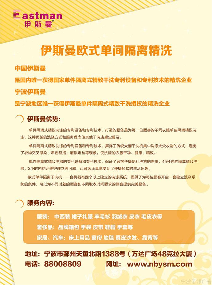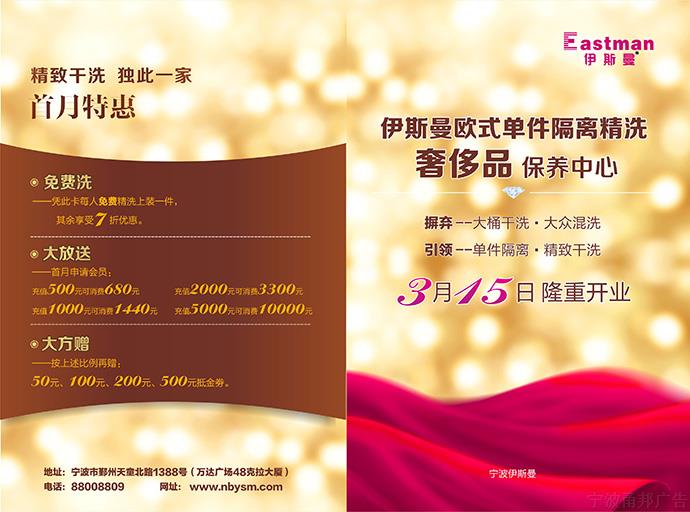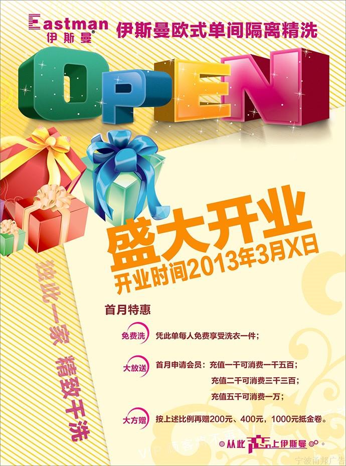 [SITESERVER_PAGE]宁波伊斯曼洗衣首站选择鄞州万达东开业,宁波甬邦广告全程进行品牌策划设计制作合作,为宁波干洗业一个新的竞争者的加入添彩!